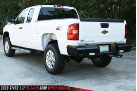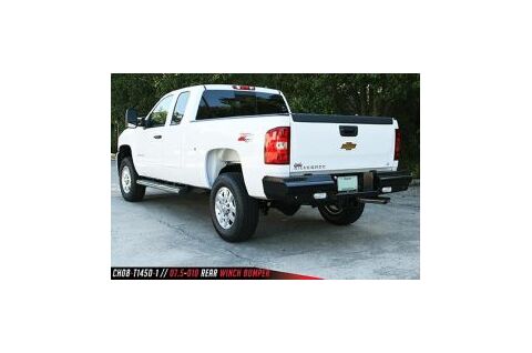 The Fab Fours Black Steel Rear Bumper comes with a black powder coat finish. It does come with install hardware. It also comes with a 1 year MFG warranty. This bumper is built to work with the OE tow hitch. It will not work without a factory tow hitch or with an aftermarket hitch. Most applications will accommodate the factory park assist sensors.