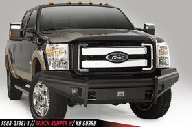 The Fab Fours Black Steel front bumper comes with a black powder coat finish. It does come with install hardware. It also comes with a 1 year MFG warranty. This bumper is built to work with the OE fog lights & comes with replacement tow hooks