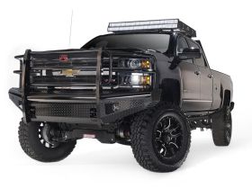 The Fab Fours Black Steel front bumper comes with a black powder coat finish. It does come with install hardware. It also comes with a 1 year MFG warranty. This bumper is built to work with the OE fog lights & comes with replacement tow hooks. It does not have holes fro front park assist sensors, & you would need to drill them.