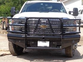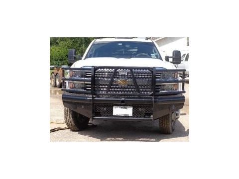 The Ranch Hand Legend Series full front bumper comes with a black powder coat finish. It does come with install hardware. It also has a welded on 2" receiver. It will work with factory tow hooks, fog lights, & park assist sensors although the sensors are not guaranteed to function properly. It also comes with a 1 year MFG warranty.