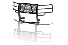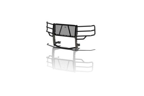 The Legend series Grille Guard by Ranch Hand comes with a black powder coat finish. It does come with install hardware. It also comes with a 1 year MFG warranty This guard will work with the front park assist sensors although the sensors are not guaranteed to work properly.