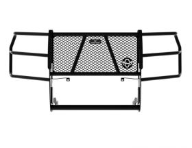 The Legend series Grille Guard by Ranch Hand comes with a black powder coat finish. It does come with install hardware. It also comes with a 1 year MFG warranty. This is the guard for trucks without a front camera. It will not work correctly with front park assist sensors.