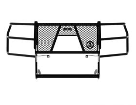 The Legend series Grille Guard by Ranch Hand comes with a black powder coat finish. It does come with install hardware. It also comes with a 1 year MFG warranty. This is the guard for trucks with a front camera. It will not work correctly with front park assist sensors.