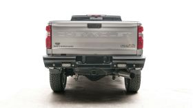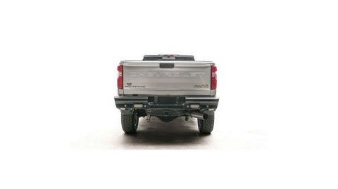 The Fab Fours Black Steel Rear Bumper comes with a black powder coat finish. It does come with install hardware. It also comes with a 1 year MFG warranty. This bumper is built to work with the OE tow hitch. It will not work without a factory tow hitch or with an aftermarket hitch. Most applications will accommodate the factory park assist sensors. DOES NOT ACCOMODATE FACTORY BLIND SPOT MONITORS.