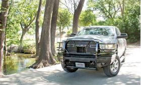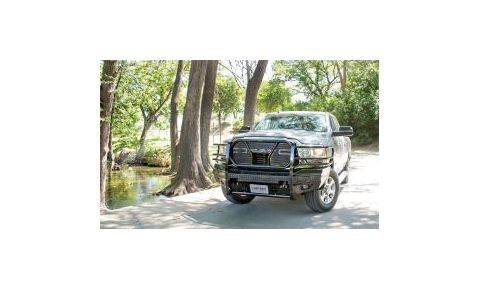 The Frontier Gear Full Front Bumper comes with a black powder coat finish. It does come with install hardware. It also comes with a 1 year MFG warranty. It will work with the factory fog lights & tow hooks. It has a cutout in the center of the guard for the front camera to see through. It has holes for the front park assist sensors, but they will NOT work correctly with this bumper installed. We do not normally stock this product & order it as needed. Lead time is typically 4 weeks.