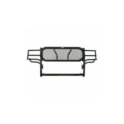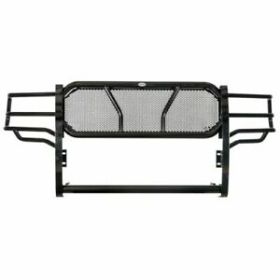 The Frontier Gear Grille Guard comes with a black powder coat finish. It comes with install hardware & instructions. Some models require drilling to install. It comes with a 1 year MFG warranty. It will not work with front park assist sensors. It does NOT have a hole for the front camera to see through.