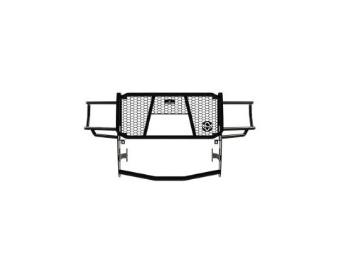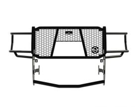 The Legend series Grille Guard by Ranch Hand comes with a black powder coat finish. It does come with install hardware. It also comes with a 1 year MFG warranty. This is the guard for trucks with a front camera. It will not work correctly with front park assist sensors.