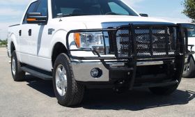 The grille guard by Thunderstruck comes with a black powder coat finish.  It does come with install hardware.  It also comes with a 1 year MFG warranty.