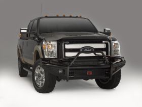 The Fab Fours Black Steel front bumper comes with a black powder coat finish. It does come with install hardware. It also comes with a 1 year MFG warranty. This bumper is built to work with the OE fog lights & comes with replacement tow hooks