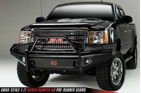 The Fab Fours Black Steel front bumper comes with a black powder coat finish. It does come with install hardware. It also comes with a 1 year MFG warranty. This bumper is built to work with the OE fog lights & comes with replacement tow hooks