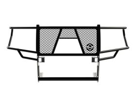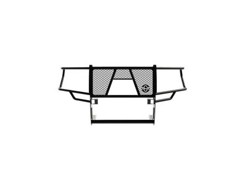 The Legend series Grille Guard by Ranch Hand comes with a black powder coat finish. It does come with install hardware. It also comes with a 1 year MFG warranty. This is the guard for trucks with a front camera. It will not work correctly with front park assist sensors.