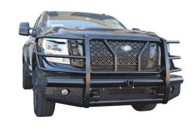 The Steel Craft HD front bumper comes in a mild black powder coat finish. It comes with bracketry, nuts, bolts, instructions, & a 1 year warranty. It will accommodate factory tow hooks & factory fog lights. It has a welded in 2" receiver.